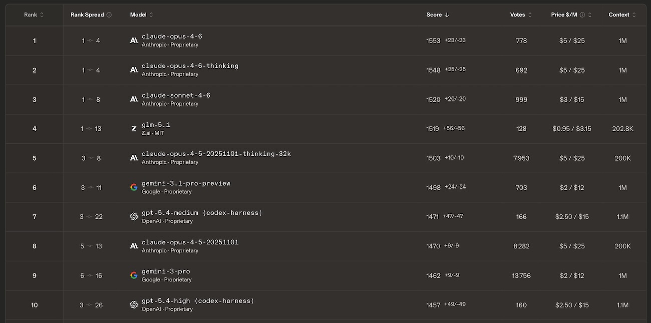 Anthropic conserve une emprise considérable sur le secteur du développement assisté par IA. Cinq des six premières places du classement général de la WebDev Arena sont occupées par des modèles Claude : Opus 4.6 Thinking prend la tête, devant Opus 4.6, Sonnet 4.6 (4e), et les deux déclinaisons d’Opus 4.5 (5e et 6e). Seul intrus dans au sein du groupe de tête, GLM-5.1 de Z.ai, qui s’intercale à la 3e place.