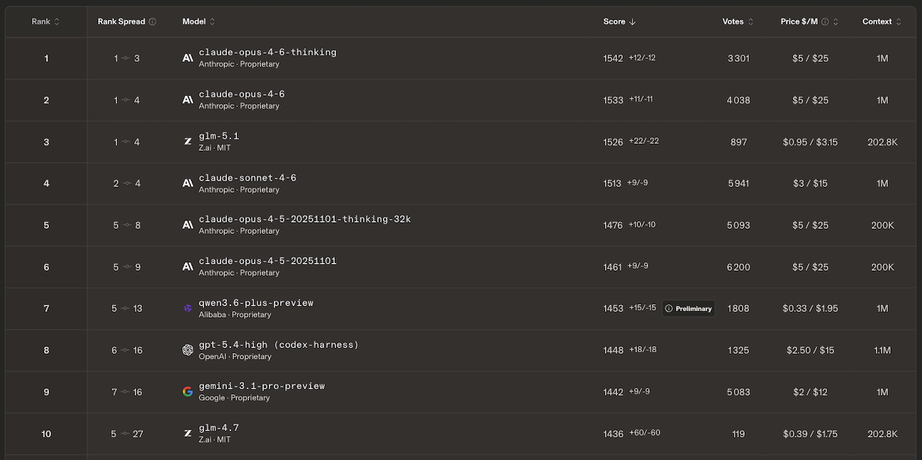 Côté OpenAI, le renouvellement générationnel se poursuit. GPT-5.4 High, dans sa déclinaison « codex-harness », fait son entrée à la 7e place, remplaçant GPT-5.2 High qui sort du top 10. Google maintient Gemini 3.1 Pro Preview à la 8e position, mais perd ses deux modèles Gemini 3 Pro et Gemini 3 Flash, qui quittent le top 10. Alibaba fait quant à lui une apparition avec Qwen3.6-plus-preview, directement 9e (score encore préliminaire), tandis que Z.ai double sa présence avec GLM-4.7 en 10e position.